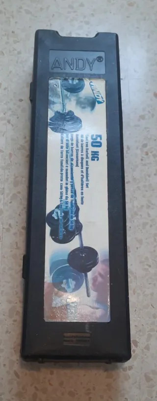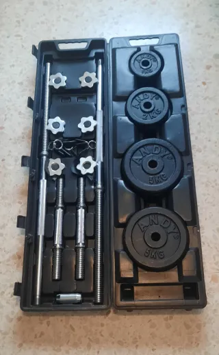Este es un set de pesas de hierro fundido de 50 kg de la marca ANDY. - Incluye barra y mancuernas. - Peso total de 50 kg. - Discos de 1kg 2kg 5kg - Fácil de transportar y guardar, caja con ruedas.