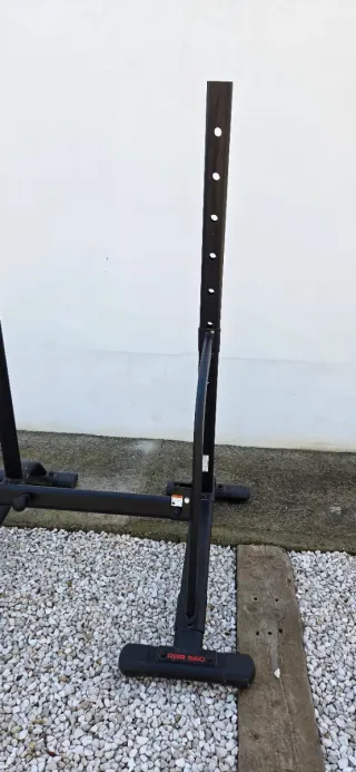Banco de musculación Domyos HG 970 con soportes para barra. - Diseño en color negro y rojo. - Altura ajustable en los soportes. Esta bastante usado, tiene algo de óxido pero nada que no se pueda dar una mano de spray. Y los asientos tienen la madera un poco desgastada. A la estructura le faltan los soportes para la barra y un tapón de arriba. Para usarla se puede hacer sin ningún problema, pero se podría arreglar con facilidad para un mejor uso de hay su precio.