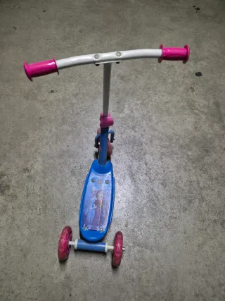 Patinete infantil con diseño de Frozen, ideal para los más pequeños. Cuenta con tres ruedas para mayor estabilidad. - Manillar ajustable. - Puños de goma para un mejor agarre. - Base con estampado de Frozen.