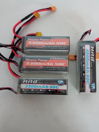 Conjunto de baterías Lipo 6S de alta calidad. En perfecto estado y con poco uso.Siempre cargadas en balanceo y guardadas en storage.Incluye dos baterías de 3300mAh 50C y una de 3300mAh 60C, además de una batería de 4000mAh 60C. - Dos baterías Youme Power 3300mAh 50C. - Una batería HRB 3300mAh 60C. - Una batería HRB 4000mAh 60C. - Conectores XT60 . Batería de 4000mah (35€) Batería 3300mah(30€) (Si compras dos ó más las dejo en 25€ cada batería.)