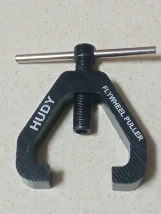 Herramienta para extraer volantes de coches rc de la marca Hudy. - Fabricado en aluminio negro. - Diseño en forma de Y. - Incluye tornillo central y barra de giro.