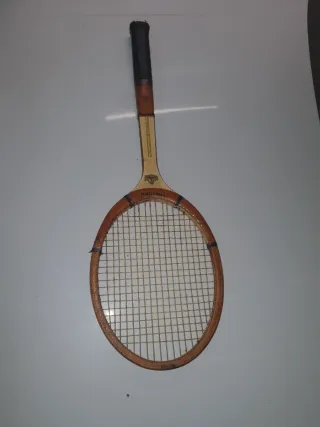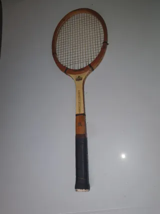 Raqueta de tenis clásica, ideal para coleccionistas o para revivir la nostalgia del tenis. - Marco de madera. - Cuerdas de nailon. - Empuñadura marrón muy oscuro.