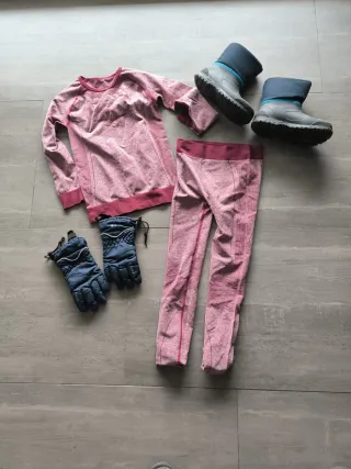 Conjunto de ropa térmica y botas de nieve para peques. Ideal para mantenerse abrigado en la montaña. - Conjunto de dos piezas: camiseta y pantalón térmico, 122-128 cm. Ambos, como nuevo. - Botas de nieve con forro interior, talla pie 30-31, como nuevas. - Guantes de nieve azules de la marca decathlon usados, regalamos con el pack anterior.