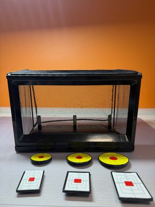 Diana plegable para practicar tiro. - Incluye dianas circulares y cuadradas. - Estructura de malla negra.