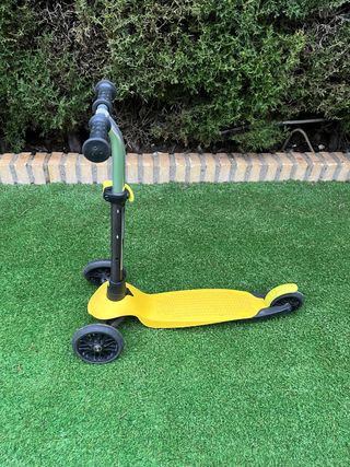 Patinete infantil de tres ruedas en color amarillo. - Plataforma antideslizante. - Ruedas de goma. - Manillar ajustable.