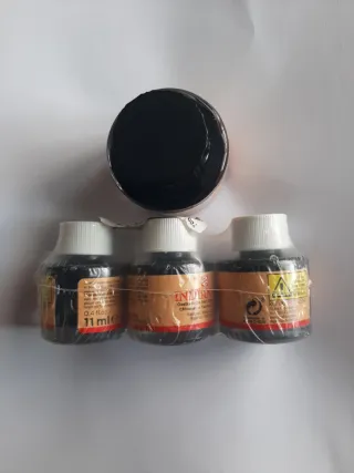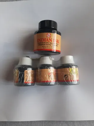 Lote de 1 bote 30Ml y 3 botellas 11 Ml de tinta china negra de la marca Talens. Resistente al agua. -1 botella de 30Ml por 3€ - 3 botellas de 11 ml cada una 2€ - Tinta china negra. - Marca: Talens. - Resistente al agua.