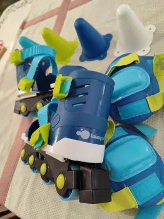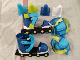 Set de patines y protecciones para niños. Incluye patines ajustables y equipo de seguridad. - Patines en color azul con detalles en verde y amarillo. - Incluye rodilleras y coderas.Mochilas para transportar. - Varios conos de entrenamiento en diferentes colores.medidas interior del zapato 20cm. Máximo Ajustable.