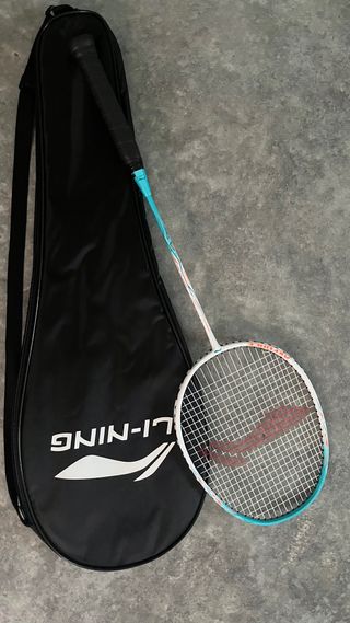 Raqueta de bádminton Li-ning Axforce 9. - Color blanco con detalles en azul y naranja. - Incluye funda protectora negra con logo Li-ning.