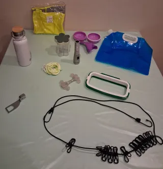 Conjunto de artículos útiles para actividades al aire libre. - Botella de acero inoxidable con tapa de madera. - chaleco reflectante amarillo. - Recipiente multiespecias. - Linterna. - urinario femenino. - sujeta bolsas para basura. - Bolsa de agua plegable. - Tendedero flexible con pinzas. - Picas. - Cuerda reflectante. - airlock puertas vehiculo