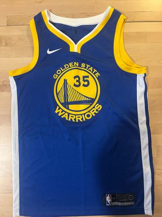 Camiseta de baloncesto de los Golden State Warriors con el número 35. - Color azul. - Detalles en amarillo y blanco. - Logo de Nike. - Diseño del equipo.