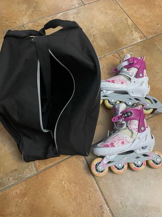 Para empezar a patinar. Patines en linea marca krafwin. Pone talla 40, pero yo tengo un 38 de pie y me están bien. Se incluyen las protecciones; muñequera, coderas y rodilleras y la funda de los patines
