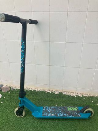Patinete de estilo freestyle con un diseño llamativo. - Manillar negro con puños grises. - Base azul con detalles en negro y verde. - Ruedas blancas y negras.