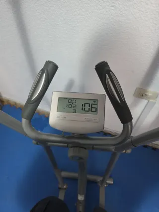 Elíptica de Decathlon en buen estado, ideal para entrenamientos en casa. - Estructura metálica plateada. - Pedales y manillar grises. - Pantalla digital en la consola con lectura de km/h, tiempo de uso, ritmo cardíaco, y calorías quemadas. Le falta uno de los plásticos de la pata nada que afecte al funcionamiento