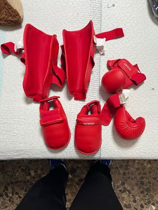 Set de protecciones para artes marciales en color rojo, niñ@. Talla 5 guantes Talla S espinilleras - Incluye espinilleras. - Incluye guantes. - Incluye patucos.