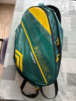 Bolsa de pádel Cannaben Padel+ en color verde y amarillo. Diseño moderno y espacioso. - Compartimento principal amplio. - Cremalleras resistentes. - Correas ajustables para llevar como mochila.