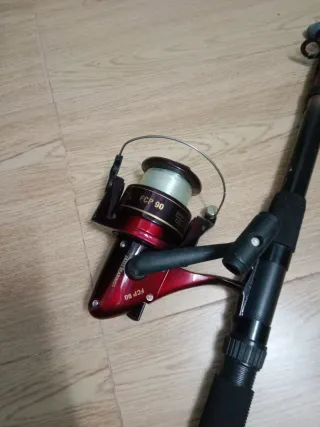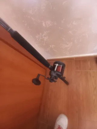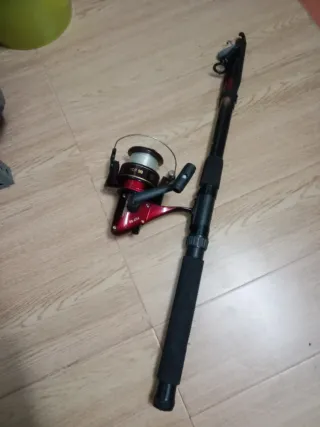 Conjunto de caña y carrete de pesca. - Caña de pescar negra y roja. - Carrete de pesca rojo con detalles negros.