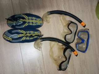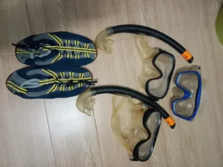 Conjunto de equipo para buceo y snorkel. - Tres máscaras de buceo con dos tubos. - Dos escarpines o zapatillas acuáticas de color azul talla 38 - Dos tubos de snorkel negros con boquilla naranja.