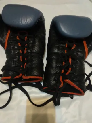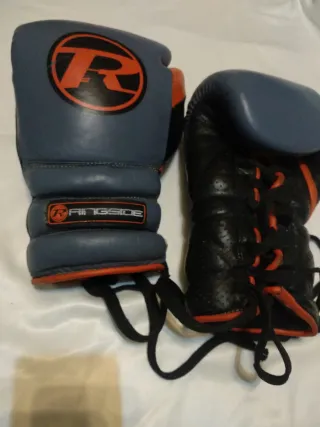 Par de guantes de boxeo de la marca Ringside. Presentan un diseño bicolor en azul y negro con detalles en naranja. - Cierre con cordones. - Logo de Ringside en la muñeca. - Logo de R en la parte superior.