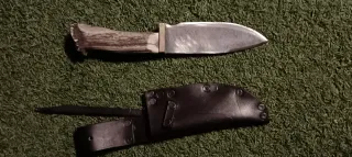 Cuchillo de hoja vaquera con mango de asta y funda de cuero. - Hoja de metal pulido. - Mango de asta de ciervo. - Funda de cuero negro con remaches.