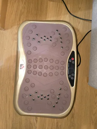 Vibrating fitness platform designed for home workouts. Its surface is black with gold accents. - Textured surface for enhanced grip. - Digital control panel.