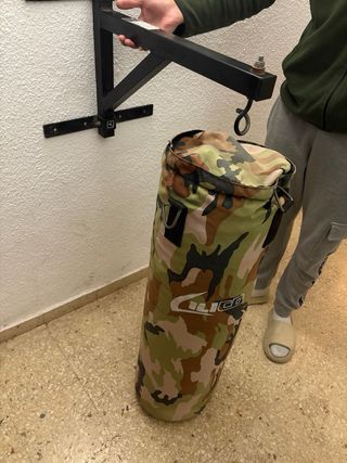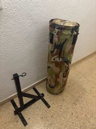 Se vende saco de boxeo con diseño de camuflaje y su soporte. - Saco de boxeo con estampado militar. - Soporte metálico negro.