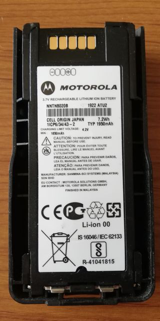 VENDO baterías de Litio (LiIon) 1950mAh ORIGINALES Motorola para walkies Tetra Motorola MTP3100, MTP3200, MTP3250, MTP3550, etc. Mod. NNTN8020. Usadas en buen uso: 10€. NUEVAS 35€. Precio unitario.