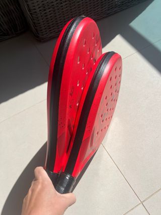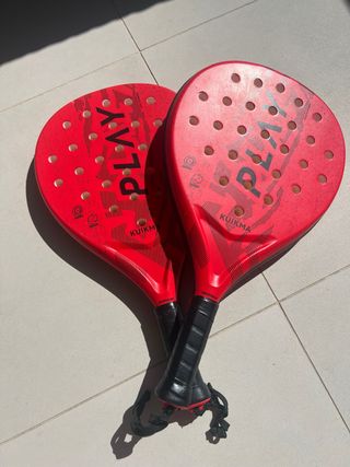 Se venden dos palas de pádel KUIMA PLAY en color rojo. - Diseño con agujeros. - Logo PLAY en la cara. - Empuñadura negra.