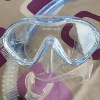 Set de gafas de buceo con tubo de snorkel. - Lente de cristal templado. - Marco de plástico azul. - Tubo de silicona flexible.