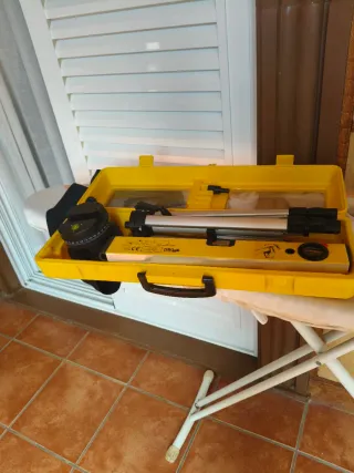 Se vende nivel láser profesional con trípode y maletín de transporte. - Maletín amarillo resistente. - Trípode metálico ajustable. - Nivel láser con base. - Incluye accesorios.