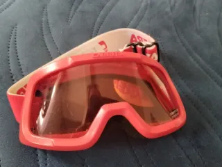 Gafas de esquí de la marca Carrera, diseñadas para niños. El marco es de color rojo vibrante y la lente tiene un tinte anaranjado. - Marco de color rojo. - Lente con tinte anaranjado. - Correa ajustable con logo de la marca.