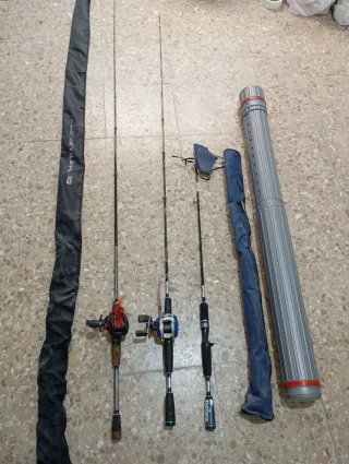 Conjunto de equipo para pesca de black bass, ideal para la modalidad de casting. 2 cañas casting lista para su uso y una de recambio - Bolsa de pesca Capérlan. - Dos cajas de señuelos. - Varios señuelos de pesca de diferentes marcas y modelos (Zoom, Gary Yamamoto). - Caña de pesca Abu Garcia Veritex.