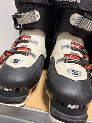 Botas de esquí de la marca Salomon, en excelente estado. - Color blanco y negro. - Cierres de hebilla y velcro. - Talla 28/8.5.