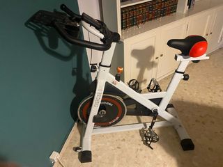 Bicicleta spinning sin apenas uso, se uso 2 veces y se guardo, el sillín original lo tengo y está en perfectas condiciones, funciona perfecta, está nueva