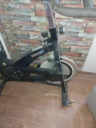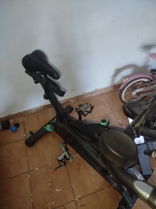 Bicicleta spinning poco uso por no poder usarla.pantalla controla tiempo,velocidad,distancia,calorías,pero uno de los cables que va a la pantalla está roto y no le llega información; la pantalla se enciende,está bienasí que solo habría que poner bien el cable...solo en venta a domicilio
