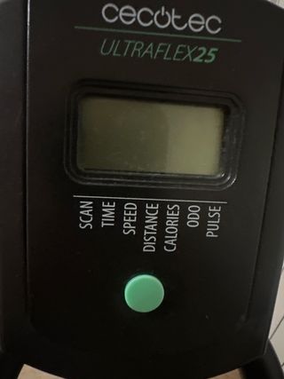 Bicicleta de spinning Cecotec modelo Ultraflex 25. - Pantalla digital con funciones: SCAN, TIME, SPEED, DISTANCE, CALORIES, ODO, PULSE. - Botón de control verde.
