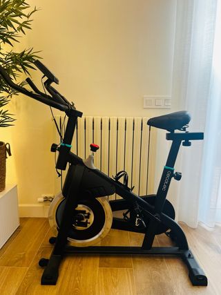 Bicicleta estática de Decathlon, ideal para entrenamientos en casa. - Diseño compacto y funcional. - Sillín acolchado para mayor comodidad. - Pantalla digital para seguimiento de ejercicio.