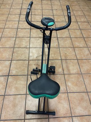 Bicicleta estática de la marca INXIDE, modelo XSEB. Diseñada para entrenamientos en casa. Tiene el cable del pulsómetro empalmado porque se cortó accidentalmente - Estructura robusta y estable. - Asiento acolchado. - Manillar ajustable. - Pedales con agarre. - Ruedas para facilitar el transporte.
