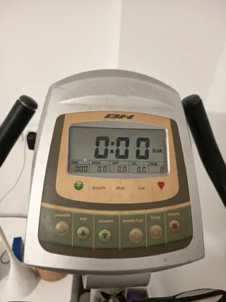 Bicicleta elíptica de la marca BH. Diseñada para entrenamientos cardiovasculares en casa. - Pantalla LCD con información de tiempo, velocidad, distancia y calorías. - Botones de control para ajustar la resistencia y el programa. - Diseño ergonómico para mayor comodidad.