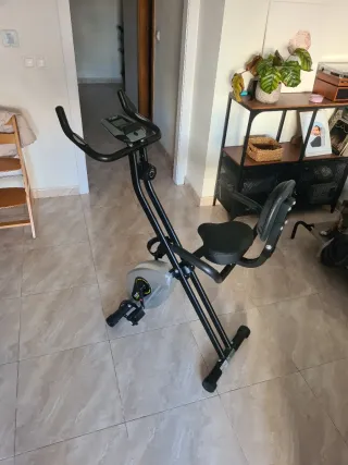 Bicicleta estática plegable, ideal para entrenar en casa. Poco usada, en buen estado. - Diseño compacto y fácil de guardar. - Asiento con respaldo para mayor comodidad. - Manillar ajustable.