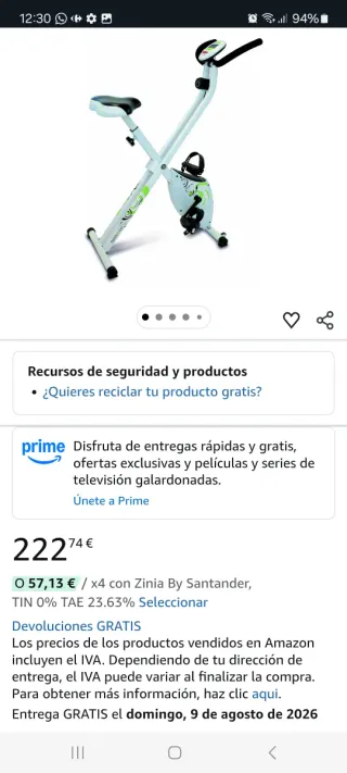 Se vende en Amazon por 150€. El sillín ancho, acolchado y ajustable en altura, junto con el manillar elevado con pantalla LCD grande y sensores de pulso, ofrecen una posición ergonómica que cuida las rodillas y la espalda, incluso en sesiones largas La resistencia se ajusta en 8 niveles para adaptarse a sus necesidades; con un peso máximo de usuario de 130kg. Con 4, 4 de 5 estrellas de 29.077Reseñas