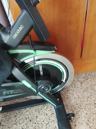 Bicicleta de spinning en buen estado, ideal para entrenamientos en casa. - Diseño moderno en color negro y verde. - Sillín acolchado para mayor comodidad. - Portabidón integrado.