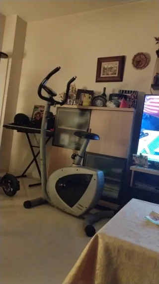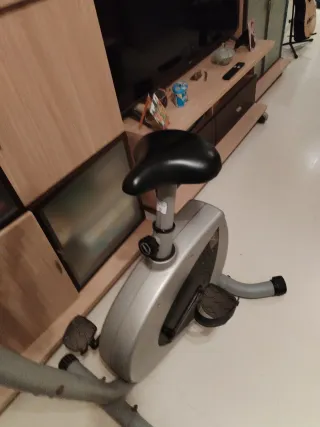 Bicicleta estática en buen estado. Ideal para hacer ejercicio en casa. - Resistencia regulable. - Monitor digital (se ve algo deteriorado en la imagen). - Diseño compacto y fácil de guardar.