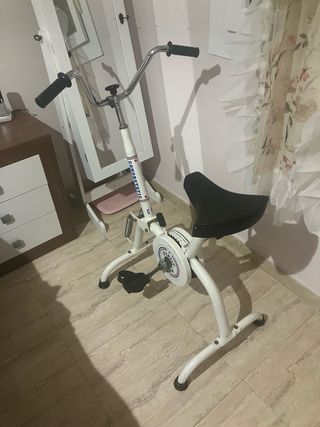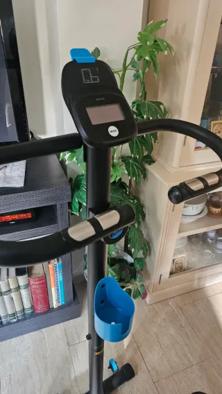 Bicicleta estática de la marca Sportana, ideal para entrenamientos en casa. Su diseño permite un ejercicio cardiovascular efectivo. - Asiento con respaldo regulable. - Pantalla digital para seguimiento de datos. - Pedales con agarre. - Tiene dos bandas de fitness. - Un disco de cadera. - Estructura plegable para fácil almacenamiento. Soporta un peso hasta 140kg y la altura entre 145cm y 185cm. Fácil de plegar y guardar. Esta nueva, pero he perdido la tapadera en la pata trasera del soporte.