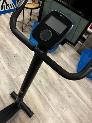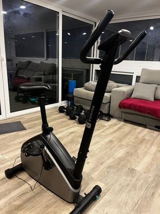 Bici elíptica Domyos 520 comprada en Decathlon. Se monta fácil, incluye llave de 13, para realizarlo. Va muy bien. Me encanta porque no necesita ir conectada a la luz. Con el mismo pedaleo ya se enciende. Con ajuste de pedales para diferentes alturas. Lo único que tiene es la pequeña rasgada en el mango izquierdo, que enseño en foto. La vendo con la afombrilla de suelo incluida. Que costó 50€ y está como nueva.