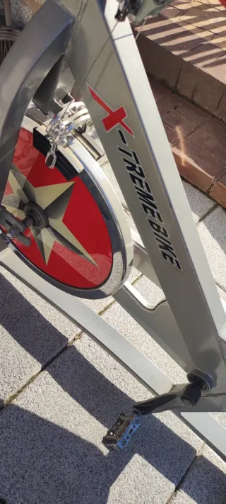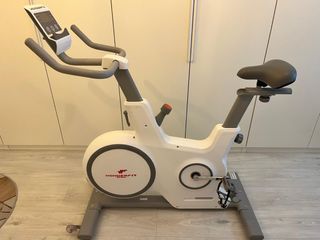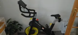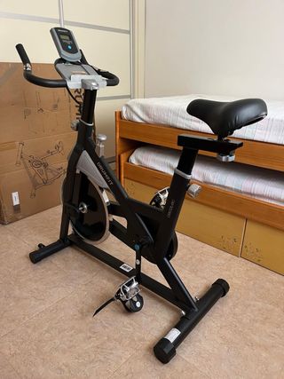 Bicicleta de spinning usada ocasionalmente tras la compra y sin uso desde hace tiempo. Sillín y manillar regulables así como pedales ajustables. Pulsómetro y consola en la que visualizar el tiempo, la velocidad, la distancia y las calorías.