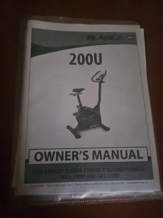 Manual del propietario para la bicicleta estática Bladez 200U. - Incluye instrucciones de servicio y contacto. - Información de contacto de Bladez Fitness.