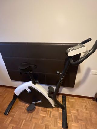 Bicicleta estática Domyos Essential 03 con muy poco uso. Calculo que no se usaria ni durante una semana, y un uso muy suave. Se puede probar antes de llevar. -Sillin acolchado y regulable en altura. -Consola con indicadores de calorias, distancia, tiempo y velocidad. -Rueda para ajustar la dureza del pedaleo. -Manillar acolchado y amplio para mayor comodidad de agarre