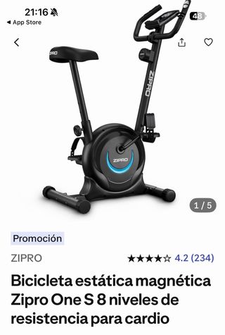 Bicicleta estática magnética Zipro One S, ideal para entrenamientos cardiovasculares en casa. Cuenta con 8 niveles de resistencia para ajustar la intensidad del ejercicio. - Diseño moderno y compacto. - Sillín ajustable en altura. - Pantalla digital para seguimiento de datos.