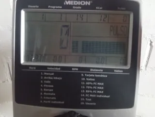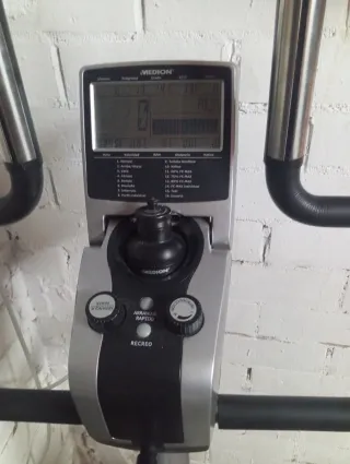 Bicicleta estática de la marca Medion. - Pantalla digital con información de tiempo, velocidad, RPM, distancia y pulsaciones. - Programas de entrenamiento preestablecidos. - Botones de arranque rápido y recreo.