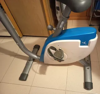 Bicicleta estática Domyos en color blanco y azul. Ideal para entrenamientos en casa. - Diseño compacto. - Pedales con sujeción 1 está mordido se ve foto - Ajuste de altura del sillín.